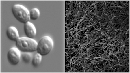Her lab found that the biofilm form of Candida produces proteins that free-floating Candida do not, demonstrating that biofilms not only manage their genomes differently, but also suggesting that these yeast somehow “know” when they’re members of a community and “behave” differently in that context. Nobile also showed that even distantly related microbes, like bacteria and yeast (which are much more closely related to animals than bacteria), can form biofilms together.
